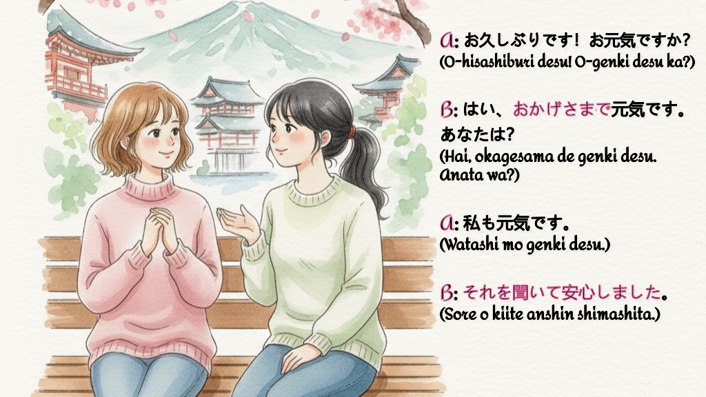 In giapponese, dire “sono felice” (ureshii desu) per la salute di qualcun altro potrebbe suonare a volte un po’ troppo diretto o emotivo. Usare, invece, il concetto di sollievo (anshin) è l’espediente più sicuro e rispettoso per affermare che siamo contenti di sapere che l’altra persona sta bene e che non ci sono stati problemi nel tempo in cui non ci si è visti.